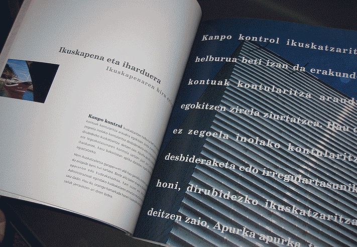 Las entidades públicas del País Vasco, por ley, han de estar impresas en las dos lenguas oficiales en la CA. Esto suele producir problemas al duplicar los textos en cada página, por lo que esta vez decidimos editar los idiomas por separado (uno a continuación del otro), en el mismo soporte.