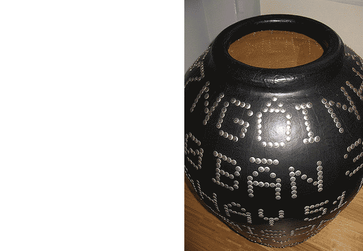 Un simple percance casero nos dio la solución: una caja llena de chinchetas metálicas se cayó, desparramándolas por todo el suelo cercano a la pieza decorativa. Chinchetas metálicas que podían incrustarse en el jarrón de cartón negro. A prioiri el resultado podía ser interesante, al combinarse lo metálico con el soporte negro mate de la superficie donde pincharlas…